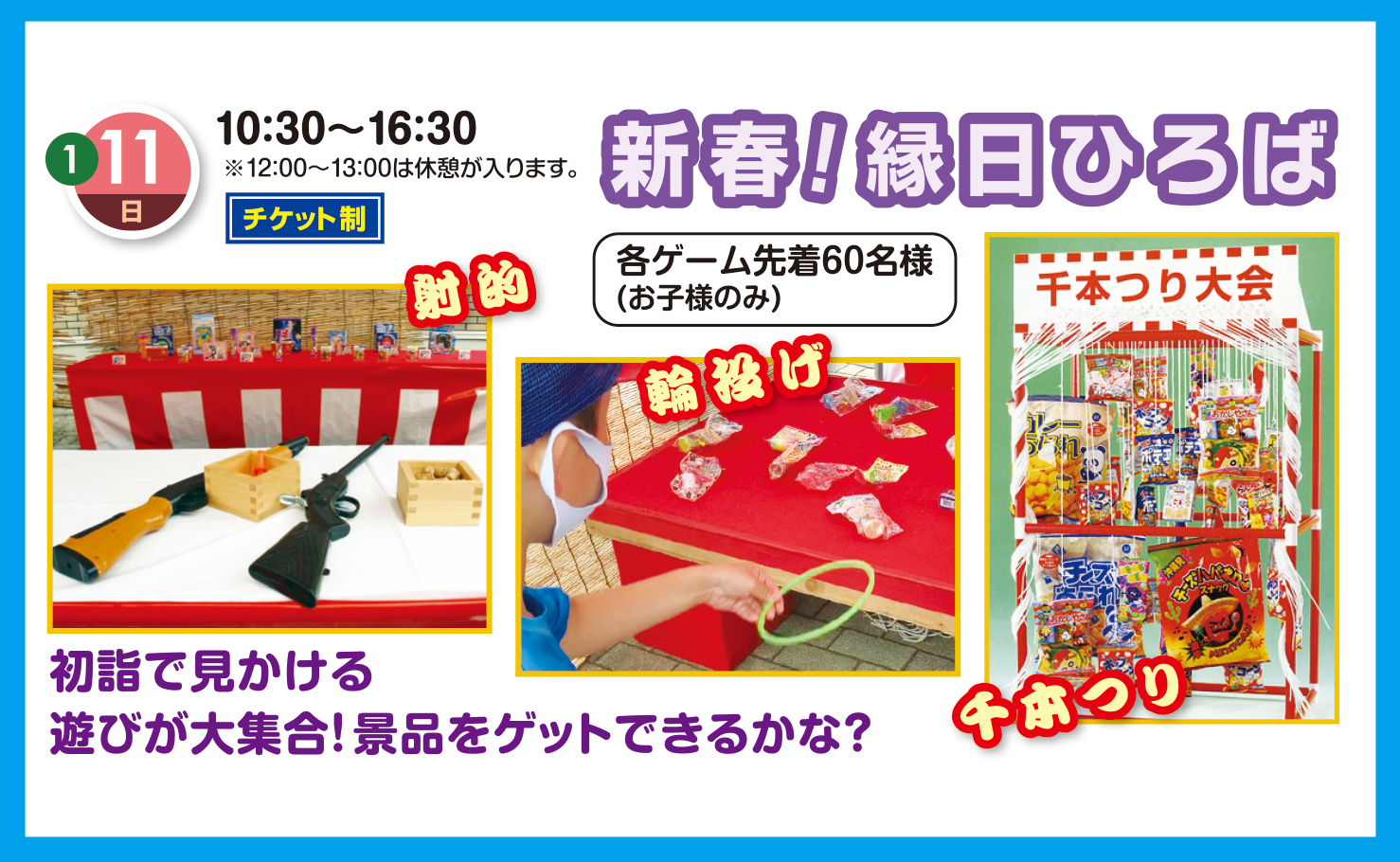 【2026年1月11日(日)】新春!縁日ひろば 2025年12月24日 最終更新日時 : 2025年12月24日 child 初詣で見かける遊びが大集合!景品をゲットできるかな? ●日程:1/11(日)●時間:10:30~16:30●参加:各ゲーム先着60名様(お子様のみ)・チケット制 ※12:00~13:00は休憩が入ります。