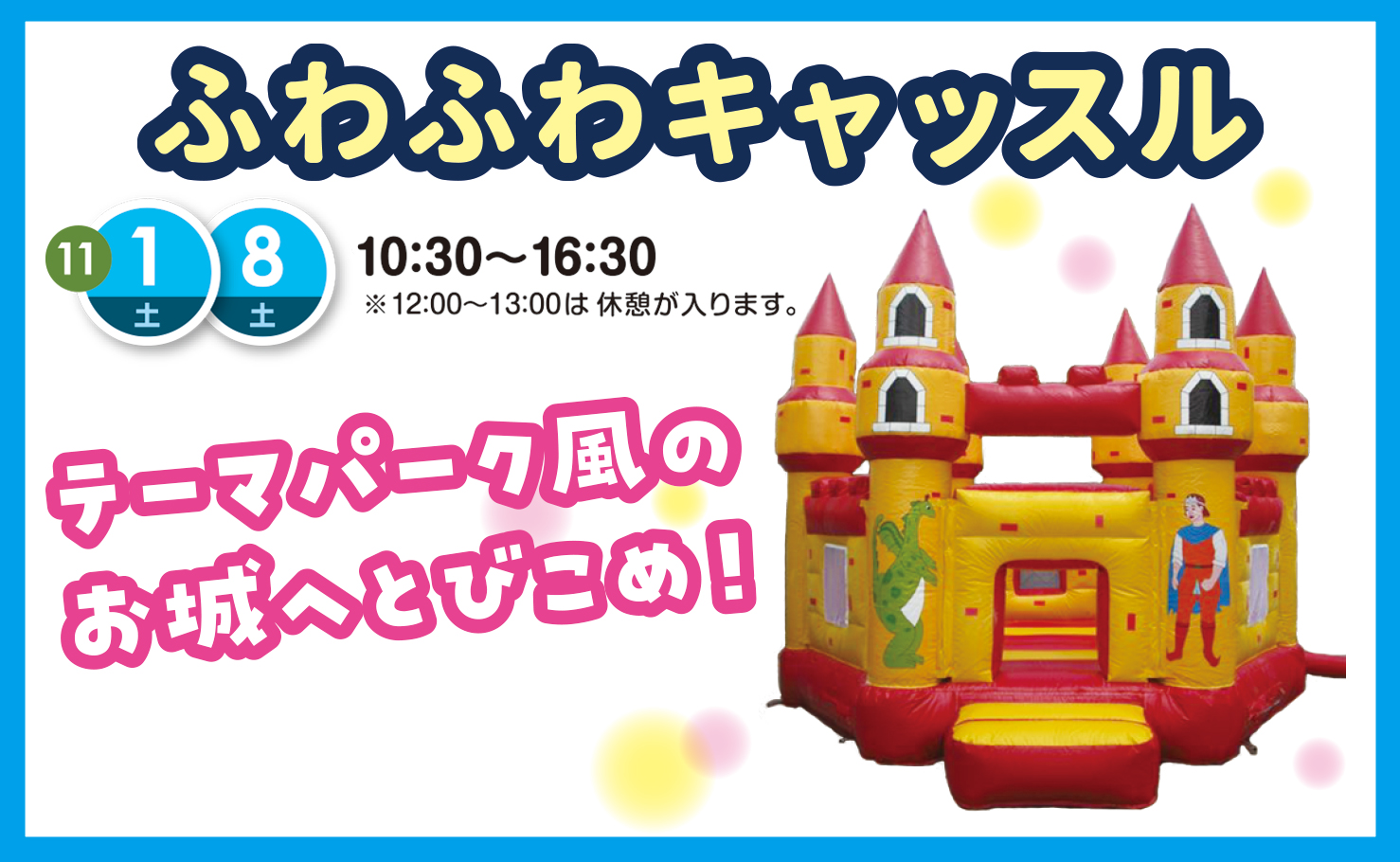 【2025年11月1日(土)・8日(土)】ふわふわキャッスル 2025年10月28日 最終更新日時 : 2025年10月29日 child テーマパーク風のお城へとびこめ! ●日程:11/1(土)・11/8(土)●時間:10:30~16:30 ※12:00~13:00は休憩が入ります。