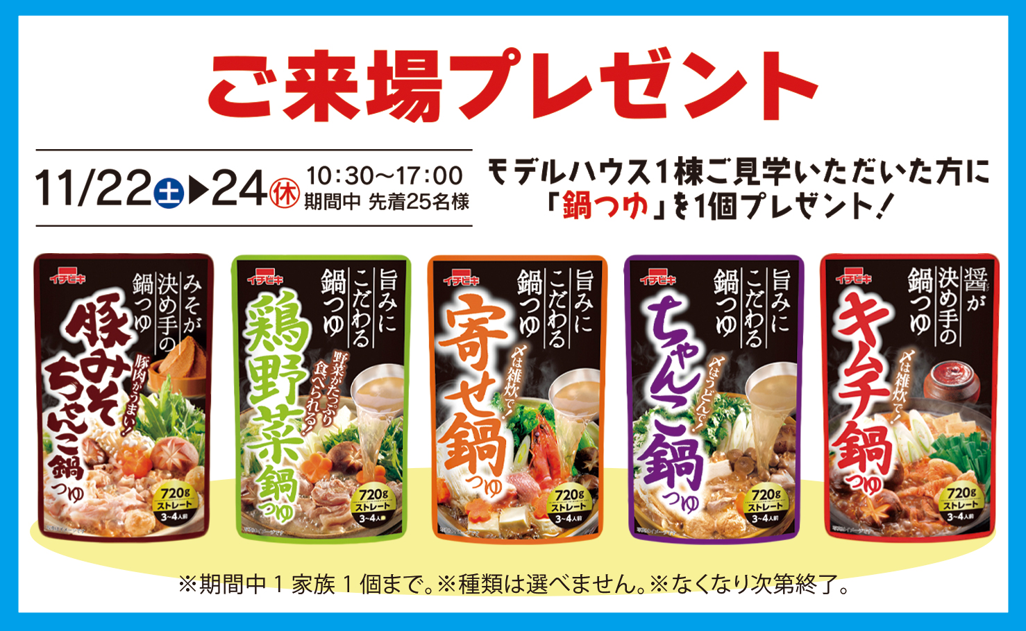 モデルハウス1棟ご見学いただいた方に「鍋つゆ」を1個プレゼント!