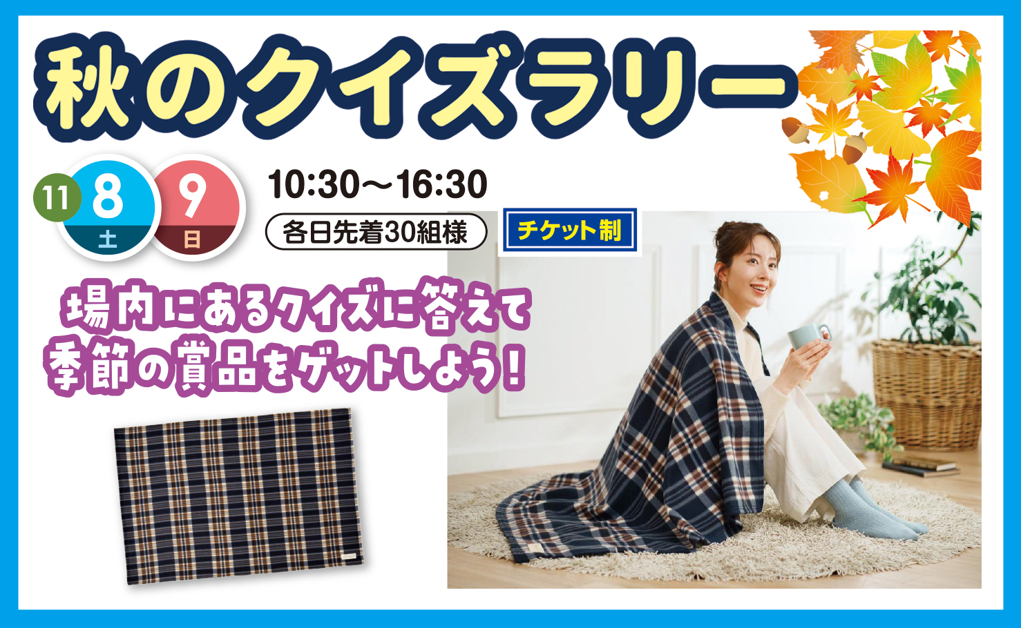 【2025年11月8日(土)・9日(日)】秋のクイズラリー 2025年10月28日 最終更新日時 : 2025年10月29日 child 場内にあるクイズに答えて季節の賞品をゲットしよう! ●日程:11/8(土)・11/9(日)●時間:10:30~16:30●参加:各日先着30組様・チケット制