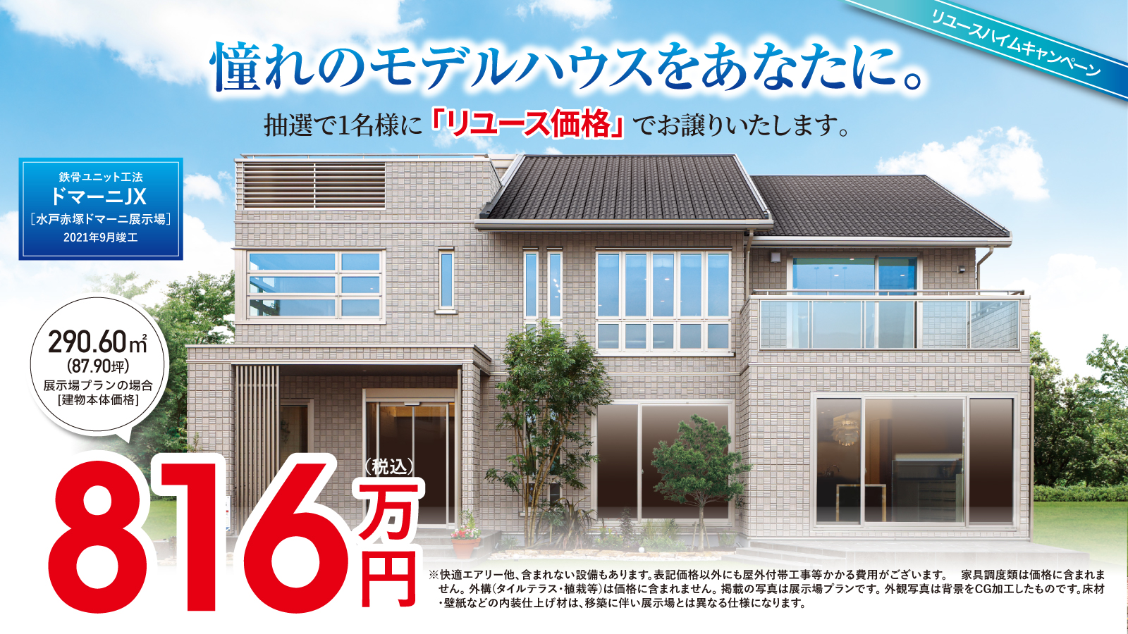 【セキスイハイム(グランツーユー)】 816万円でお家が当たる?!リユースハイムキャンペーンお申込み受付中! 2025年10月19日 最終更新日時 : 2025年10月20日 child 抽選で1名様にリユース価格でモデルハウスをお譲りいたします! ~お申込みから抽選までのスケジュール~ 1.WEBからお申し込み「申し込む」ボタンよりご応募下さい。必要事項をご入力頂き、申込完了となります。お申込み期間:2026年1月25日(日)16:00まで 2.当選発表抽選結果はホームページ上に発表し、ご当選者には直接ご連絡いたします。当選発表日:2026年1月30日(金)18時頃予定 キャンペーン期間中は、住まいに関する多彩なイベントを開催しております。家づくりに役立つ、楽しいイベントもぜひこの機会にご参加ください。 詳細はこちら お問い合わせはこちら