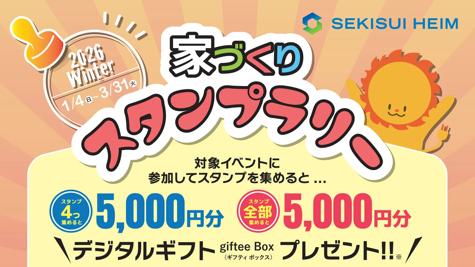 【セキスイハイム(グランツーユー)】 家づくりスタンプラリー 2026年3月1日 最終更新日時 : 2026年3月20日 child お得に家づくりの知識を得て、体験ができるキャンペーンです。イベント参加でデジタルギフトをGETしよう! 対象イベントに参加してスタンプを集めると、4つで5,000円分、5つ全部でさらに5,000円分のデジタルギフトをプレゼント! 参加必須イベントと選べるイベントを組み合わせて、お得に家づくりが学べる機会です♪ 開催期間:1/4(日)~3/31(火) 詳細はこちら お問い合わせはこちら