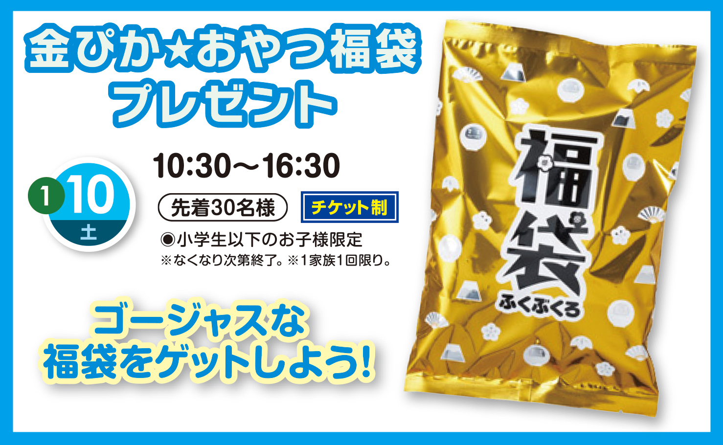 【2026年1月10日(土)】金ぴか★おやつ福袋プレゼント 2025年12月24日 最終更新日時 : 2025年12月24日 child ゴージャスな福袋をゲットしよう! ●日程:1/10(土)●時間:10:30~16:30●参加:先着30名様・チケット制 ※小学生以下のお子様限定。※なくなり次第終了。※1家族1回限り。