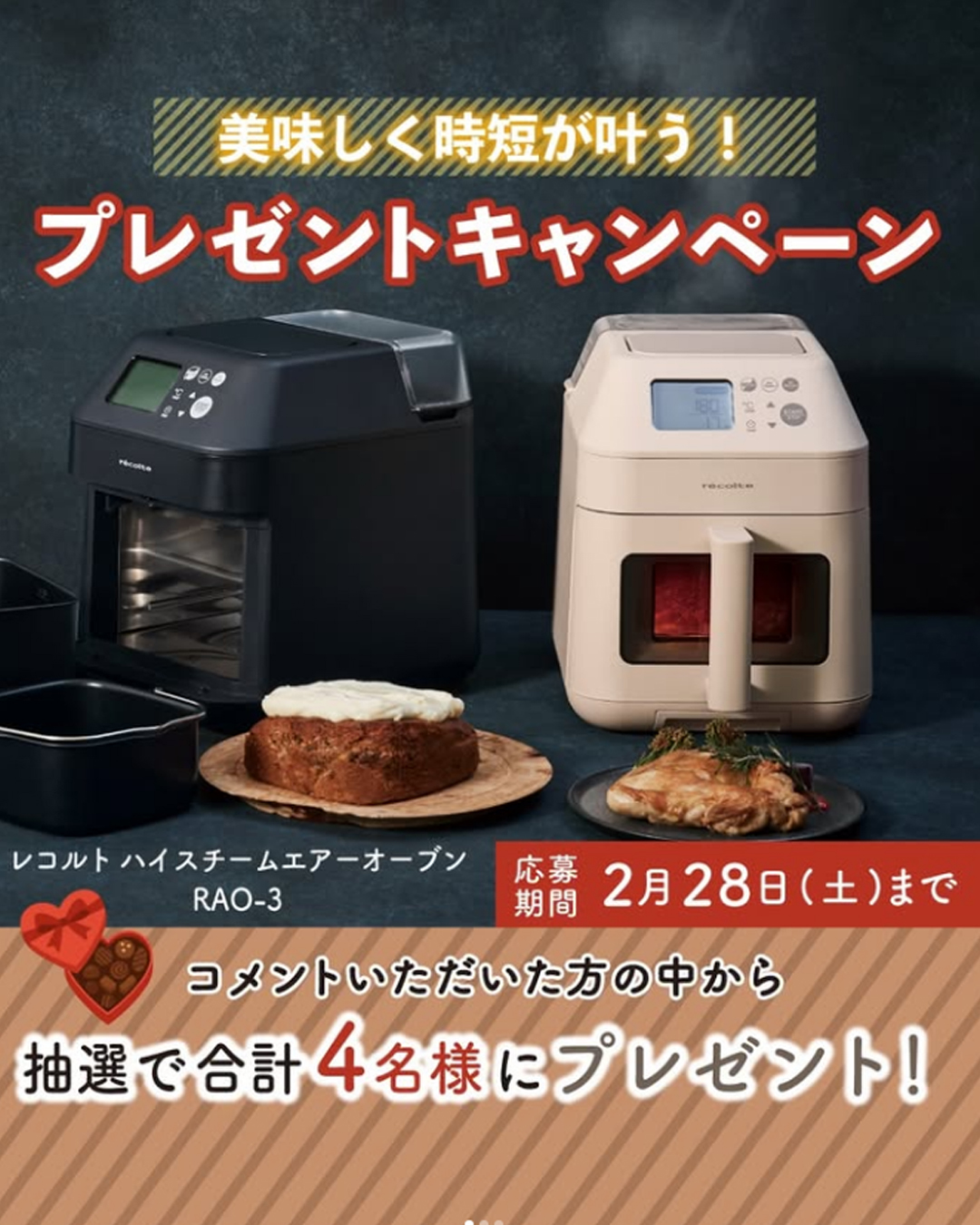 【ヤマダホームズ RASIO(ラシオ)】\「美味しく時短が叶う!」プレゼントキャンペーン🎁/ 2026年2月1日 最終更新日時 : 2026年2月9日 child ヤマダホームズ公式Instagramにてキャンペーン開催! ■応募方法① @yamadahomes をフォロー②「クリームホワイト」・「ナチュラルブラック」どちらが欲しいかコメントしてください ■プレゼント賞品・レコルト ハイスチームエアーオーブン RAO-3(各カラー2名様ずつ)【 計4名様】 ■応募期間2025年2月28日(土) 23:59まで ヤマダホームズ公式Instagramはこちら お問い合わせはこちら